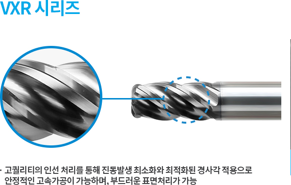 - 부등분할과 최적화된 경사각을 적용하여 안정적인 고속가공 가능 - 진동 최소화로 가공 후 고품질의 면조도 구현 - 마찰 최소화 효과로 안정적이고 원활한 칩 배출