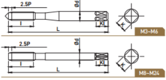 • 막힌 구멍 가공용으로써 보통 주철, 강인 주철, 황동 주물, 열가소성수지 등의 피삭재를 대량 가공할 경우에 적합
